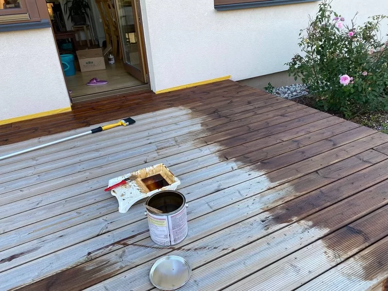 Veca, pelēka, izdegusi terase — atjaunota vienā nedēļas nogalē. Uzklāj pats, divas kārtas, gatavs. Nākamajā sezonā — tikai viena kopšanas kārta.